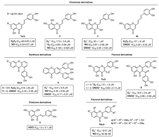 In the Figure 3, the active derivatives of each family to scavenge the referred to ROS and RNS are summarized in order to show which type of structures are more suitable for scavenging each reactive species. Thus, among the active compounds 1,4,5 to scavenge H2O2, the 2-styrylchromone (2-SC) derivatives 1a,b, presenting a catechol moiety at the B-ring in conjugation with the Cα=Cβ double bond of the styryl moiety, and free OH groups at C-5 and C-7, emerged as lead compounds with IC50 values of 48.9–50.3 µM (in comparison with ascorbic acid used as positive control, IC50 = 625.5 ± 49.6 µM) [13]. On the other hand, the 2-SC derivative 2, possessing two catechol units at the A- and B-rings, was more effective for scavenging 1O2 (IC50 = 4.69 ± 0.64 µM) than ascorbic acid, used as a positive control (IC50 = 10.2 ± 1.5 µM) [12], and the flavones 7. In addition, the xanthone 6, bearing two catechol units at C-2 and C-3, is a potent scavenger of O2•− (IC50 = 10.4 ± 0.8 µM) vs. tiron, used as a positive control (IC50 = 273 ± 32 µM), and compounds 2,3,8,10. The xanthone 6 was also an effective scavenger of ONOO−, showing an IC50 value of 0.17 ± 0.01 µM vs. ebselen, used as a positive control (IC50 = 0.50 ± 0.03 µM) [11], and compounds 3–5,7,8. Regarding the scavenging activity against HOCl, the chalcones 9 were the most active scavengers, specifically, the derivative bearing a catechol moiety at the B-ring and free OH groups at C-2′, C-4′, and C-6′ was the most potent compound (IC50 = 1.0 ± 0.1 µM) in comparison with ascorbic acid, used as a positive control (IC50 = 11 ± 1 µM) [8]. Finally, to scavenge •NO, the flavonols 10a,b were definitely the most potent compounds, as they are active in the nanomolar range (IC50 = 55–58 nM) compared to quercetin, used as a positive control (IC50 = 1.3 ± 0.1 µM) [9], and to compounds 1–3,6.