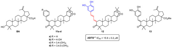 Using betulinic acid (BA), which is a lupane-type pentacyclic triterpenoid commonly isolated from the bark of birch trees, as a raw material to produce amphiphilic antioxidants, we synthesized the polyhydroxylated 19,28-epoxyoleanane-3,28-dione-type 11a–d and 12, and methyl betulonate-type 13 compounds (Figure 4) [14]. We found that the derivative 12, bearing a catechol moiety and an extended π-conjugated carbonyl system, emerged as a lead compound, since it was revealed to be the most efficient scavenger of the 2,2′-azino-bis(3-ethylbenzothiazoline-6-sulfonic acid) radical cation (ABTS•+) (IC50 = 15.9 ± 0.2 µM). In fact, it was more active than α-tocopherol (IC50 = 19.2 ± 0.1 µM), used as a positive control and the pristine BA (no activity was found up to the highest tested concentration—800 µM).