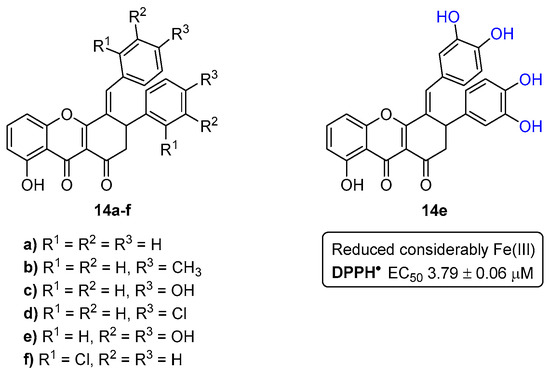 The antioxidant activity of xanthenediones 14a–f (Figure 5) was evaluated by their ability to scavenge the 2,2-diphenyl-1-picrylhydrazyl free radical (DPPH•) and to reduce Fe(III) [15]. The compounds were tested at different concentrations and, naturally, the reducing ability increased with concentration. Among the tested compounds, the derivative 14e reduced considerably the ferric ion, being more efficient than 2,6-bis(1,1-dimethylethyl)-4-methylphenol (BHT) and similar to quercetin, used as positive controls. This result confirmed that a catechol moiety in a molecule is important for the reducing power activity. In addition, this derivative was also the most potent scavenger of DPPH•, presenting an EC50 value of 3.79 ± 0.06 µM. Furthermore, these compounds were also evaluated for their anti-acetylcholinesterase activity, which will be discussed later in Section 6.