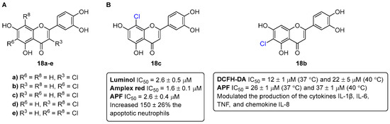 Then, the anti-inflammatory potential of these chlorinated flavones 18a–e (Figure 8) were also tested in the activity of COX-1 and COX-2, and in the production of cytokines (interleukins (IL-6 and IL-1β) tumor necrosis factor (TNF)), and the chemokine IL-8, as well as in the production of reactive species, using human whole blood as a representative in vitro model [22]. None of the chlorinated flavones 18a–e were able to inhibit COX at the highest tested concentration (100 μM). However, 6-chloro-3′,4′,5,7-tetrahydroxyflavone (18b) was able to reduce the production of reactive species, even in hyperthermic conditions, and also modulated the production of the cytokines IL-1β, IL-6, TNF, and the chemokine IL-8b (Figure 8).