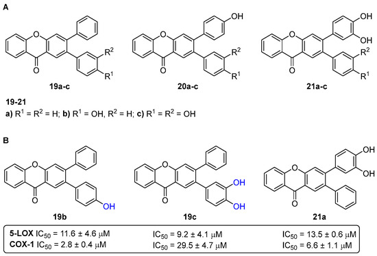 Chemical structures of the hydroxylated 2,3-diarylxanthones 19–21 (A) and the emerged dual-acting anti-inflammatory agents 19b,c and 21a (B).