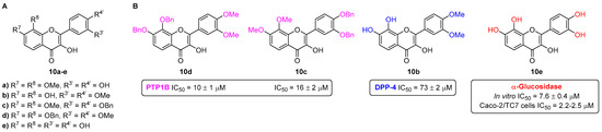 The flavonols 10a–e were designed to possess catechol moieties at the A-ring and/or B-ring (Figure 10) [9], allowing the assessment of SAR studies involving these compounds as antidiabetic agents, namely, as DPP-4, PTP1B, FBPase, and α-glucosidase inhibitors.