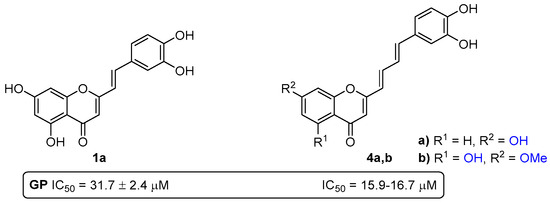 Several chromone derivatives bearing a styryl or a 4-arylbutadienyl group at C-2 were evaluated for their in vitro ability to inhibit GP [32]. The SAR study indicates that the presence and the position of free hydroxy groups at A and B rings is determinant for the inhibitory activity of these two families. Among the 2-SCs, compound 1a, bearing hydroxy groups at C-5 and C-7 of the A-ring and a catechol moiety on the B-ring (Figure 12), was the most active compound, with an IC50 value of 31.7 ± 2.4 µM. Moreover, the 2-(4-arylbutadienyl)chromone 4a bearing a hydroxy group at C-7 of the A-ring and a catechol moiety on the B ring (Figure 12), and compound 4b with a hydroxy group at C-5 and a methoxy group at C-7 of the A-ring, and a catechol moiety on the B-ring (Figure 12), were the most active derivatives, with similar IC50 values of 16.7 ± 1.5 µM and 15.9 ± 1.1 µM, respectively.
