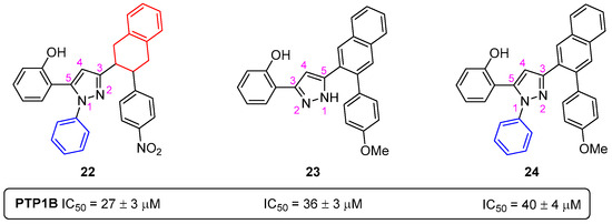 A library of twenty-two pyrazoles was evaluated for the first time as human PTP1B inhibitors [34]. The pyrazole 22, bearing a phenyl group at N-1, a 2-(4-nitrophenyl)tetralin at C-3 and a phenol at C-5 (Figure 14); pyrazole 23, holding a phenol at C-3 and a 2-(4-methoxyphenyl)naphthalene at C-5 (Figure 14); and pyrazole 24, presenting a phenyl group at N-1, a 3-(4-methoxyphenyl)naphthalen-2-yl at C-3 and a phenol at C-5 (Figure 14), were the most active compounds, with IC50 values of 27–40 µM, respectively. These findings suggest that the presence of additional benzene rings as functional groups in the pyrazole moiety increases their ability to inhibit PTP1B. The most active compounds showed selectivity over the homologous T-cell protein tyrosine phosphatase (TCPTP).