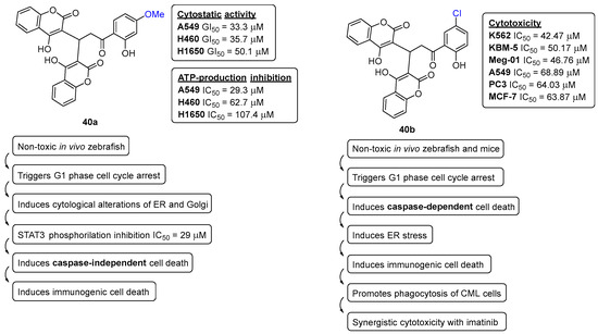 After a thorough investigation, 40a was found to strongly inhibit the proliferation of non-small cell lung cancer cells with KRAS mutations through the reduction in aldehyde dehydrogenase expression and abrogated spheroid formation. Subsequent mechanistic investigations showed that 40a triggers cellular stress, including metabolic catastrophe, mitochondrial stress, and ER/Golgi stress preceded by STAT3 inactivation, inhibiting the STAT3 transactivation and expression of its target genes linked to cell proliferation. It was also demonstrated that 40a activates sensitization against BH3 mimetics in NSCLC, leading to immunogenic cancer cell death mechanisms. Overall, this compelling evidence supports the potential of bis-coumarin templates as novel candidates for future drug investigation in lung cancer [36].