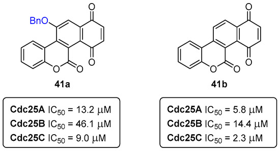 Cdc25 phosphatases are key enzymes regulating the cell cycle, being a valuable target for cancer treatment. To assess the inhibitory potential of small-molecules towards Cdc25 phosphatases, human glutathione-S-transferase (GST)-Cdc25 recombinant enzymes are usually the ideal choice. As demonstrated in previous reports, coumarin derivatives enclose a great potential in the development of alternative cancer therapies. As such, a library of coumarin-based polycycles, like the ones in Figure 18, was screened for their Cdc25 phosphatase-inhibition activity. The screening showed that the coumarins 41a,b (Figure 18) were the most potent phosphatase inhibitors with low micromolar IC50 values. More specifically, the benzylated compound 41a presented IC50 (Cdc25A) = 13.2 μM, IC50 (Cdc25B) = 46.1 μM, and IC50 (Cdc25C) = 9.0 μM, while the derivative 41b showed IC50 (Cdc25A) = 5.8 μM, IC50 (Cdc25B) = 14.4 μM, and IC50 (Cdc25C) = 2.3 μM [39].