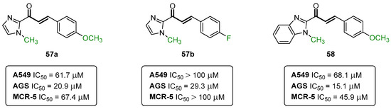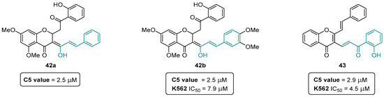 Covalent inhibitors are being increasingly recognized as an important component in drug discovery and therapeutics. Generally, covalent inhibitors are designed to form a covalent bond with a specific molecular target. The covalent bond can be either reversible or irreversible, depending on the chosen warhead. A number of different warheads have been exploited to target specific amino acid residues, including, among others, cysteine, serine, threonine, tyrosine, and lysine. One of the most commonly used warheads is the α,β-unsaturated carbonyl moiety (Figure 19), which can be found in several covalent inhibitors in clinical trials [40,41,42]. Some variations in these Michael acceptor moieties have also been reported, such as the (2-hydroxyphenyl)-3-oxoprop-1-enyl (HOPO) and the cinnamoyl (CINA) (Figure 19). In this sense, the chromanones 42a,b, as well as the 2-SC 43 were specifically designed to have the HOPO and CINA pharmacophoric moieties (Figure 20).
