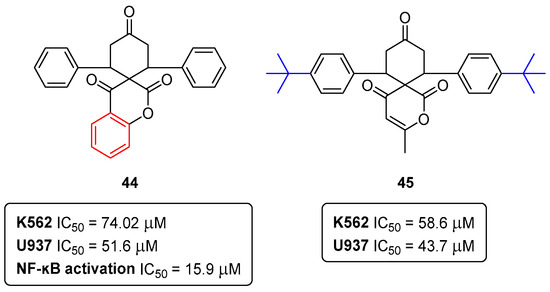 Both these seminal publications on the bis-coumarin compounds 40a,b had their starting point many years ago, back into 2014. One of the first studies involving our own synthetic bis-coumarins described their effects on leukemic cell line proliferation and NF-kB regulation [38]. The investigation carried out, in collaboration with Professor Marc Diederich (College of Pharmacy, Seoul National University), started with the synthesis of the template bis-coumarin 40c (Figure 17). The anti-proliferative effects of compound 40c on human K-562 (chronic myeloid leukemia) and JURKAT (acute T-cell leukemia) cell lines were assessed, and the results revealed the inhibition of TNFa-induced NF-kB activation in K-562 (IC50 = 17.5 μM) and JURKAT (IC50 = 19.0 μM) cell lines. Of note, the compound 40c did not affect the viability of peripheral blood mononuclear cells (PBMCs) from healthy donors, even at concentrations above 100 μM [38]. The bis-coumarin molecule 40c was deconstructed into fragments as substructures of the bis-coumarin-type compound, 20-hydroxyphenylpropione and 4-hydroxycoumarin, which were completely inactive [38].