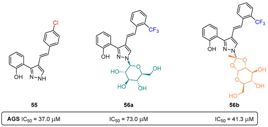 The inhibitory activity of a group of 4- and 5-styrylpyrazoles 25–39 (Figure 15) was evaluated against GP [32]. However, no relevant inhibitory activities were observed up to the highest tested concentration of 50 µM.