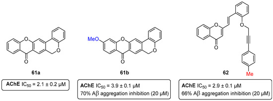 - Malafaia, D.; Oliveira, A.; Fernandes, P.A.; Ramos, M.J.; Albuquerque, H.M.T.; Silva, A.M.S. Chromeno[3,4-b]xanthones as First-in-Class AChE and Aβ Aggregation Dual-Inhibitors. Int. J. Mol. Sci. 2021, 22, 4145. [Google Scholar] [CrossRef]