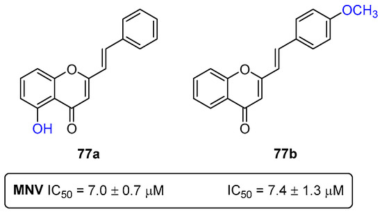 - Rocha-Pereira, J.; Cunha, R.; Pinto, D.C.G.A.; Silva, A.M.S.; Nascimento, M.S.J. (E)-2-Styrylchromones as potential anti-norovirus agents. Bioorganic Med. Chem. 2010, 18, 4195–4201. [Google Scholar] [CrossRef]