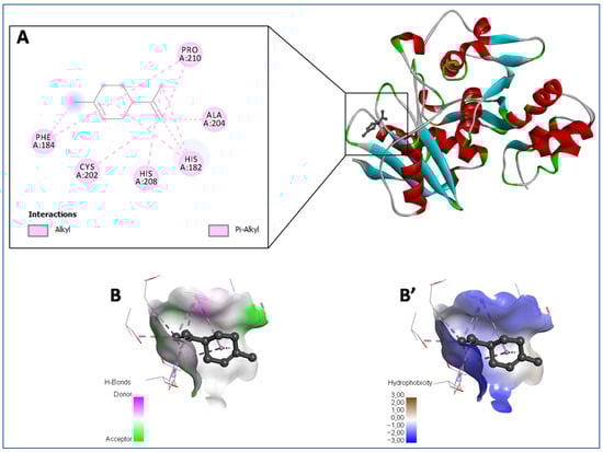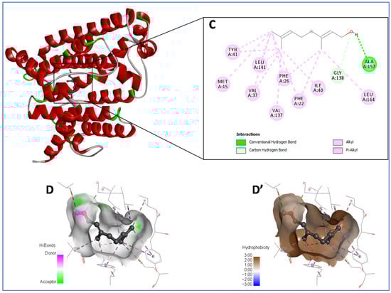 | Geranial | His182 (b,c); Cys202 (a); Ala204 (a); His208 (2b); Pro210 (a) | Met15 (a); Phe22 (2b); Phe26 (2b); Val37 (2a); Ile40 (a); Tyr41 (2b); Val137 (a); Gly138 (d); Leu141 (2a); Ala157 (e); Leu164 (a) |