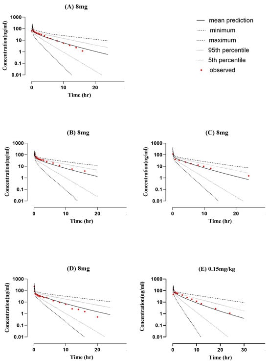 Comparison of predicted and observed systemic concentration vs. time profile in healthy subjects after intravenous application of ondansetron (8 mg dose). (A) 8 mg [], (B) 8 mg [], (C) 8 mg [], (D) 8 mg [], and (E) 8 mg [].