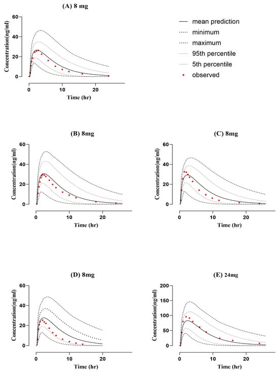 Comparison of predicted and observed systemic concentration vs. time profile in a healthy population after oral administration of ondansetron (8 mg dose). (A) 8 mg [], (B) 8 mg [], (C) 8 mg [], (D) 8 mg [], and (E) 24 mg [].