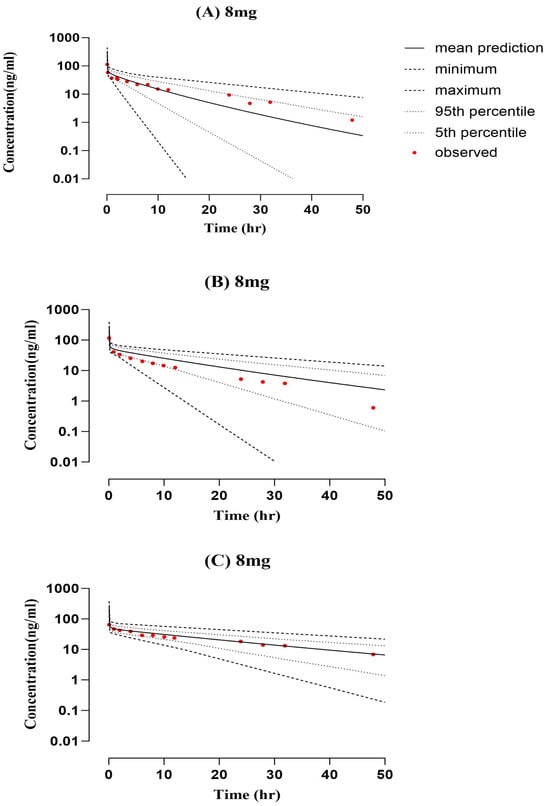 The cirrhosis model was extrapolated from the healthy model following IV administration of an 8 mg dose (Figure 3). A comparison of observed and predicted systemic concentration versus time profiles was conducted to evaluate the accuracy of the developed acceptable twofold error range. The observed/predicted ratios of AUC0-Inf after IV 8 mg administration in CP-A, CP-B, and CP-C were 1.33, 0.80, and 1.14 ng/mL, respectively. The values and ratios of AUCs, Cmax, and CL can be seen in Table 3. The accumulation of the drug in this population was described precisely using the model with respect to the Child–Pugh classification system for liver disease severity.