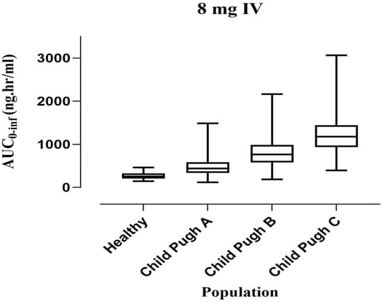 Comparing the AUC (5–95th percentile) after an IV 8 mg ondansetron dose in healthy, CP-A (mild), CP-B (moderate), and CP-C (severe) liver cirrhosis populations.