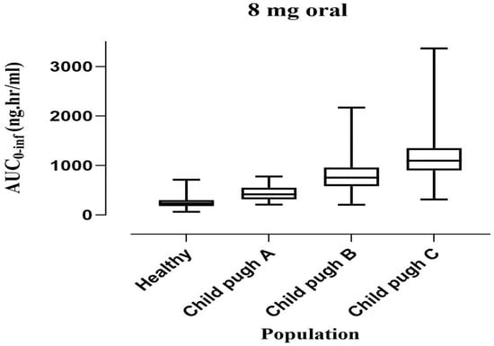 The model was extrapolated from healthy to liver cirrhosis after ondansetron 8 mg oral administration. The box-whisker plots were employed for dosage optimization, and the AUC was compared for liver cirrhosis. The median was 260.1 (246.96–280.70) with a 95% CI for AUC0-inf in the healthy population, which increased to 444.61 (80.22–1575.57) in CP-A, 773.84 (188.39–2088.88) in CP-B, and 1114.82 (296.27–3423.62) in CP-C. The visual inspection of time profiles suggested that the developed cirrhotic population PBPK model was reasonable (Figure 3). Each PK parameter’s resultant Robs/Rpre ratio was within the 2-fold error range. The box plots that illustrate these variations are shown in Figure 5.