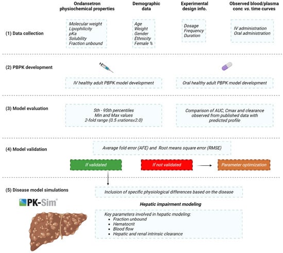 Recently, there has been an increase in the utilization of mathematical models during drug development processes. The concept of using mathematical models to mechanistically describe pharmacokinetic processes was first introduced in 1937 by Teorell []. Physiologically based pharmacokinetic (PBPK) models are mechanistic models that are developed by incorporating the physicochemical properties of drugs with previous knowledge of the physiology to predict pharmacokinetic parameters. This approach allows for the incorporation of tissue composition and blood flow to the organs for predicting drug pharmacokinetics (PKs). A PBPK model for the whole body has a clear illustration of the tissues that are linked to the pharmacokinetic processes, including absorption, distribution, excretion, and metabolism (ADME). In comparison to other pharmacokinetic approaches, the main characteristic feature of PBPK models is the availability of a complete structural representation of an organism’s anatomy and physiology []. These models can be used for ‘what if scenarios’ to predict drug exposure in untested medical conditions with subsequent dosing recommendations. These models have been successfully used to predict the PKs of different drugs in special populations (geriatric, pediatric, and obese) and disease populations (renal, hepatic, and heart failure) [,,,]. Ondansetron is used to treat a variety of medical conditions, and it is prescribed for a wide range of populations that might have special considerations, such as hepatic dysfunction. Since a high fraction of the administered dose is metabolized in the liver, any change in the blood flow to the liver or in the intrinsic clearance can have an impact on ondansetron’s PKs, suggesting adjustments in administered doses for avoidance. Therefore, applying the concept of PBPK modeling will be useful for predicting ondansetron PK in patients with various degrees of liver impairment [].