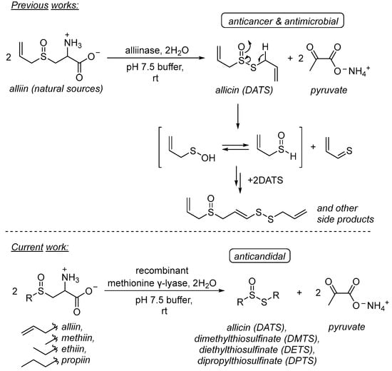 - Morozova, E.A.; Kulikova, V.V.; Rodionov, A.N.; Revtovich, S.V.; Anufrieva, N.V.; Demidkina, T.V. Engineered Citrobacter freundii methionine γ-lyase effectively produces antimicrobial thiosulfinates. Biochimie 2016, 128–129, 92–98. [Google Scholar] [CrossRef] [PubMed]