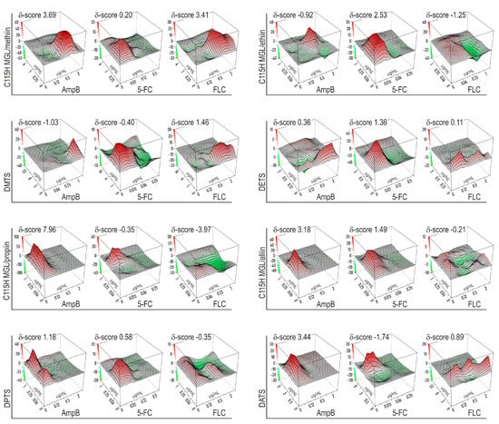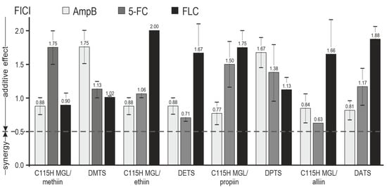 We have performed a checkerboard assay to evaluate the combinatorial effect of synthetic dialk(en)ylthiosulfinates and the corresponding TGS with commercial antifungal drugs. Data representing the synergy landscape and FICI diagram (Figure 3 and Figure 4) show that combinations of antimycotics with dialk(en)ylthiosulfinates and the TGS enhance the antifungal effect of the commercial drugs in the order FLC < 5-FC < AmpB.