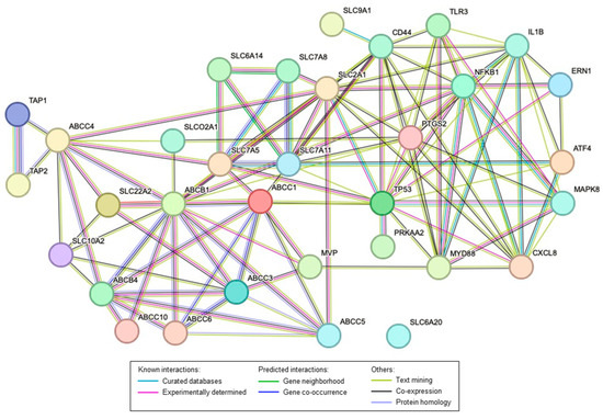STRING network interaction of the major transporters and proteins altered in the rat reflux-induced EAC model and mitigated by C-PACs. Colored lines as shown in the legend define the basis and the type of interaction between the molecules in the model. All transporters included have been identified as being altered in human EAC compared to normal esophageal tissues from non-cancer patients.