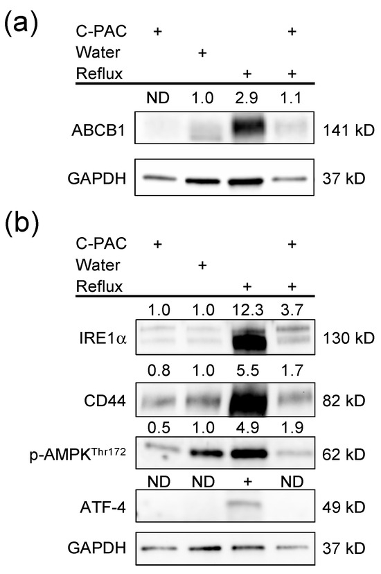 Enrichment analysis of the human EAC dataset revealed GO processes significantly dysregulated in EAC tissues compared to normal esophageal tissues with top changes linked with the transporters reported above (Table 1, Table 2, Table 3 and Table S1), including primary metabolic processes (ABCC6, SLC25A11 and SLC25A13), organic substance metabolic processes (ABCC5, ABCC6, ABCC10, SLC9A1, SLC25A11 and SLC25A13), and cellular responses to stress (SLC7A11, SLC7A5 and SLC9A1). Although there is limited availability of validated transporter antibodies with rat specificity, we did perform a Western blot with anti-ABCB1 and other transporter-linked proteins. Increased ABCB1 expression was observed in the reflux-induced rat EAC model, with C-PACs significantly mitigating ABCB1 expression (Figure 3a). A panel of immunoblots of interacting proteins of transporters was performed (Figure 2 and Figure 3b). Reflux-induced EAC led to the increased expression of stress response-related proteins, such as phospho-AMPK, IRE1α, ATF-4, as well as CD44, and C-PACs strongly reversed the reflux-induced expression levels.