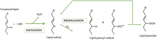 Squalene peroxidation belongs to the lipid autoxidation reaction. This process consists of two steps: initiation and propagation. Specifically, when the compound involved in the reaction is a lipid, the process is called peroxidation. Lipids are the main targets of free radical attack and, therefore, lipid peroxidation has a profound impact on the biology of living systems. The initiator of the process is a hydroxyl radical; it is self-propagating and susceptibility to oxidation increases as lipids become unsaturated. In the second phase of propagation, the free radicals formed are very reactive and unstable, so they tend to steal electrons from other contiguous molecules that will undergo the same mechanism. For this reason, it is a self-propagating reaction (Figure 2) [10,11].