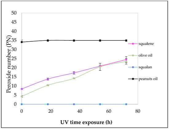Moreover, the formation of peroxides was induced through solar simulator at different times with olive oil (positive control), peanut seed oil, and squalene, and squalane used as negative control. An increase of NP was found proportional to the increase in exposure time.