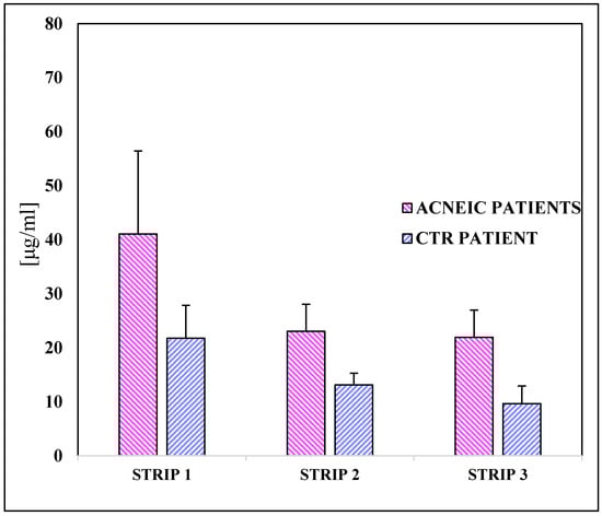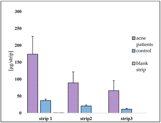 The presence of squalene was also compared analyzing the shoulder area of acneic and healthy subjects (Figure 5). In this case, the amount of recovered squalene was lower than those recovered in the face but, regardless, the quantity of the compound was more widely detected in the acneic people. The percentage of variation is lower than the previous results: 47.04% in the first strip, 43.09% in the second strip and 56.06% in the third strip.