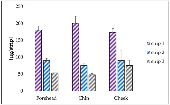 The amount of squalene decreases in the second and third strips to 89.88 µg/strip and 53.58 µg/strip for the forehead, 75.16 µg/strip and 48.20 µg/strip for the chin and 90.46 µg/strip and 75.69 µg/strip for the cheeks.