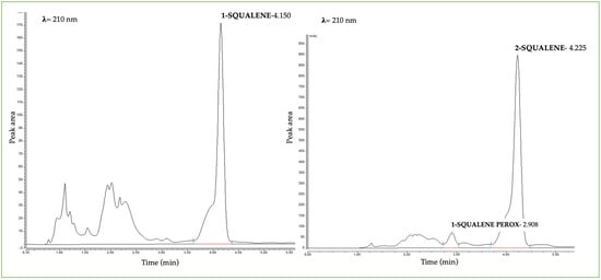 To quantify the amount of squalene, a modified HPLC method was used after long research in the literature. For instance, Ekanayake Mudiyanselage S. et al. quantify the amount of squalene with a mobile phase made of 1:1 ethanol and methanol [20]. Again, Chiba K. et al. [21] used a mobile phase consisted of 100% of methanol with a flow rate of 2.5 mL/min. At the end, Bavisetty S.C. and Narayan B. used a 100% Acetonitrile as an eluent solvent [22]. After several experiments, our method consisted of a mobile phase of 70% ethanol and 30% acetonitrile.