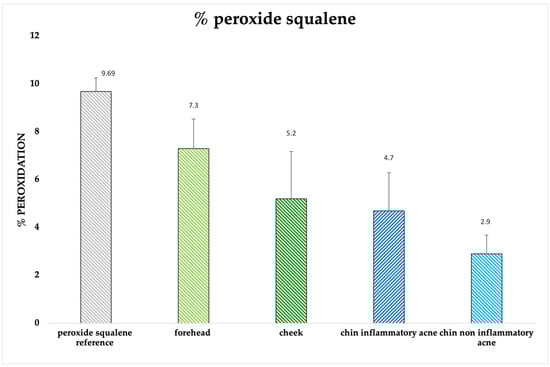 The presence of peroxide squalene was investigated by analyzing different acne-prone face areas: forehead, cheeks and both inflamed and non-inflamed chin. (Figure 8). Forehead shows a higher % of peroxide squalene (7.3%) than the other areas compared to 4.7% found in the inflammatory chin and 2.9% in the non-inflammatory chin. The % peroxide squalene in the cheek shows to have an intermediate value of 5.2%. The analyses were compared with squalene peroxide subjected to chemical oxidation and after solar exposure, obtaining a peroxidation of 9.69%. However, no peroxide form was found in healthy volunteers.