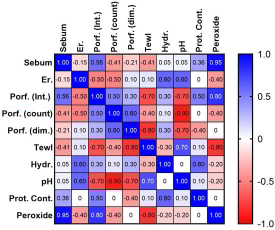 Spearman’s rank correlation coefficients obtained from parameters collected on acne-prone skin. Er = Erythema; Porf. = porphyrin; Int = intensity; dim = dimension; Hydr = hydration; Prot. Cont. = protein content; Peroxide = amount of peroxide squalene.