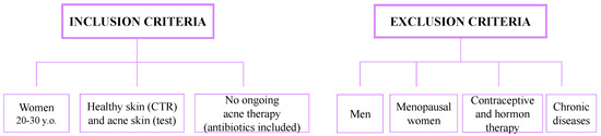 The selection of acne patients was scrupulously achieved by filling out a questionnaire based on 74 questions with the aim of having a complete history and background of each subject. In particular, the main inclusion and exclusion criteria are shown in Figure 10. Specifically, women who were not on hormone and/or antibiotic therapy and had no chronic diseases were recruited.