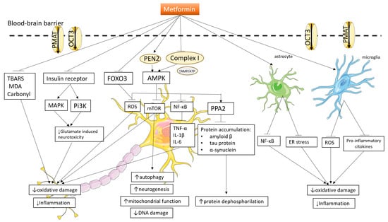 - Cao, G.; Gong, T.; Du, Y.; Wang, Y.; Ge, T.; Liu, J. Mechanism of Metformin Regulation in Central Nervous System: Progression and Future Perspectives. Biomed. Pharmacother. 2022, 156, 113686. [Google Scholar] [CrossRef] [PubMed]