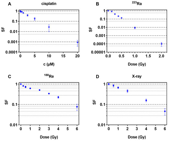 A clear dependence of the cell survival on concentration and radiation dose was observed for all different cytotoxins—cisplatin and radionuclides. In particular, the incubation of 223Ra seems to cause more damage compared to 188Re and X-rays at similar doses.