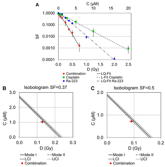 Combination experiments of cisplatin and 223Ra at certain concentration ratios are displayed in Figure 2A. It can be seen that the combined treatment resulted in a significant reduction in the survival fractions. The measured values for 223Ra and the combination were fitted according to the linear–quadratic model (LQ-Fit). The theoretical isoeffective curves for the combination of both agents were calculated for Mode I and II (see Section 4). However, the resulting lines for these two agents are almost indistinguishable. Isobolograms for the interaction of both drugs are shown in Figure 2B,C. According to Figure 2A, the combination of cisplatin and 223Ra caused a small supra-additive effect. It can be assumed that a cisplatin-induced blockade of DNA replication and DNA repair enhances cell death, leading to an increase in irreparable damage to DNA, which in turn causes cell death [28,29]. It is well known that the efficiency of radiation therapy depends on the early induction of cell damage (apoptosis), and thus, the alpha-emitter 223Ra may enhance cell death more efficiently than 188Re or X-rays as radiation characterized by low-LET emitters [30].