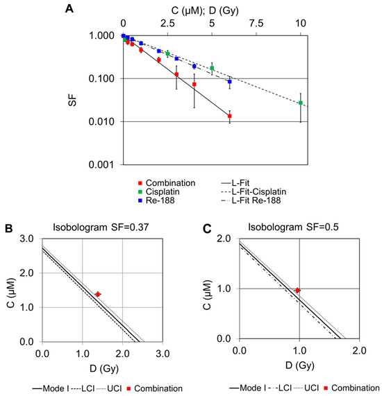 Combination experiments of cisplatin and 188Re at specific concentration ratios are shown in Figure 3A. The logarithms of the survival were fitted by a linear function (L-Fit) in both cases. Compared to the curves for cisplatin and 188Re alone, the SF values for the combined treatment are significantly smaller. Approximately 2.4 Gy are required to achieve an SF value of 0.37, whereas only about 1.4 Gy is required for the combination with cisplatin. Isobolograms for the interaction of both drugs for a surviving cell fraction of 0.37 or 0.50 are shown in Figure 3B,C.