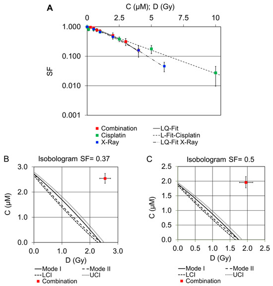 Combination experiments of cisplatin and external X-ray at specific concentration ratios are shown in Figure 4A. The survival curves for X-ray and the combination were best described by the linear–quadratic model. There are very similar proportions of surviving cells induced by X-rays and cisplatin alone, as well as for their combination at the respective dose points. Isobolograms for the interaction of both drugs are shown in Figure 4B,C. In the isobolograms, the envelope of additivity, i.e., the difference between Mode I and Mode II calculations, is clearly visible.