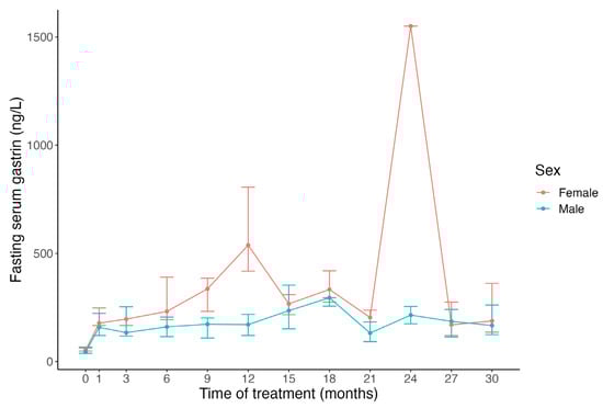 It is widely accepted that all individuals undergoing PPI treatment develop varying degrees of gastrin elevation [,]. Currently, there is limited information on which individuals are likely to develop significant hypergastrinemia, defined as gastrin levels above the upper limit of the reference range for fasting blood gastrin. Serum gastrin levels during PPI treatment have been positively correlated with basal gastrin levels prior to PPI treatment [,]. This suggests an individual effect, beyond PPI and acid inhibition itself, that likely contributes to enhanced gastrin levels. Demographics that have been associated with higher gastrin levels include H. pylori infection [], atrophic gastritis [], age [], and sex [,]. Shortly after the introduction of PPIs in the late 1980s, it was reported that females were more likely to develop higher gastrin levels early in the course of omeprazole treatment, reaching statistically significant differences at 18 and 21 months (Figure 1) []. Since the turn of the 21st century, many researchers have studied PPIs’ long-term effect on gastrin, mainly on the fasting serum gastrin values, but only a limited number of these studies have included sex-disaggregated data [,]. A significant sex difference was reported again in 2014, with higher basal and meal-stimulated serum gastrin levels among females than males on long-term PPI therapy for gastroesophageal reflux disease (GERD), whereas such sex difference was not observed in healthy controls who were not on PPIs (Figure 2) [].