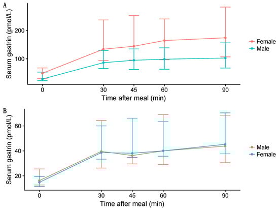 Median fasting (time = 0) and postprandial serum gastrin levels in patients with gastroesophageal reflux disease on long-term (over 2 years) proton pump inhibitor therapy (A) and controls not taking proton pump inhibitors (B). The graph is based on data from 100 patients (44 females) and 50 healthy controls (25 females) [,]. The error bars show the 25th and the 75th interquartile range. Female patients (red line) had significantly higher gastrin levels than males (blue line) pre- and postprandial, whereas such differences were not found in the control group (males in red, females in blue) []. Reprinted/adapted with permission from Ref. [].