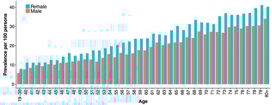 In recent years, concerns have been raised about the increasing prevalence of patients on long-term PPI therapy. Although the incidence of new therapy with PPIs remains stable, the prevalence of PPI therapy continues to rise [,,]. Some studies have shown that females generally use PPIs more often than males [,,,]. In a recent systematic review that described global PPI use patterns by demographics, females comprised 56% of PPI users in the general population; 60 of the 65 studies included in the analysis provided sex information []. The same review reported that nearly two-thirds of the users were on high doses (≥defined daily dose (DDD)) []. Similar to almost all types of drugs, PPI dosage has not been sex-specific, but females often receive higher milligram/kilogram doses than males. A nationwide drug utilization study from Iceland that described the outpatient PPI use among the entire adult population found that in addition to the rising prevalence of PPI use across time, the prevalence increased with higher age and was higher among females than males in all age groups (Figure 3) []. In addition, long-term PPI use (over 1 year) was highest among the elderly population, and they are also generally at greater risk for polypharmacy and adverse drug reactions because of the metabolic changes associated with ageing [,].