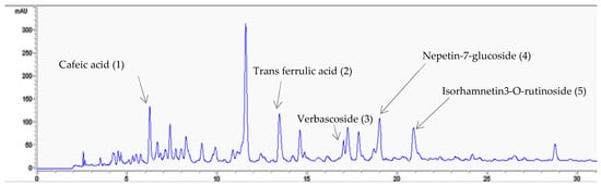 In terms of quantity, nepetin-7-O-glucoside (30.82 μg/mL) was the most abundant component, followed by transferulic acid (10.33 μg/mL (w/w) (DW). Verbascoside and caffeic acid concentrations were present in smaller amounts in the plant infusion (7 μg/mL).