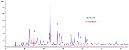 The chromatographic method adopted for analyses is based on a detection set at 324 nm. The Agilent 1100 Series HPLC system supplied with a diode array detector (DAD) is used. The chromatographic device is a computer-controlled agilent 1200. A reversed-phase Kinetex Evo C18 column placed in an oven at 30 °C is used for the separation of the different analytes in the infusion extract. The mobile phase consists of a mixture of water, acetonitrile and formic acid. Mobile phase A is formed by a combination of acetonitrile and formic acid (1%). Mobile phase B is formed by 99% water and 1% formic acid. The gradient program is conducted in the following way: 10% A, 90% B (0 min), 20% A, 80% B, (20 min), 25% A, 75% B (30 min), 35% A, 65% B, (40 min) and 10% A, 90% B10 (50 min). The rate of mobile phase elution is 1 mL/minute. Samples are filtered using a 0.20 μm filter prior to injection. The injected volume is 20 μL. Identification of the peaks of phenolic compounds is obtained by comparing their retention times as well as their UV spectra with those of available authentic standards [46,47]. All standards are purchased from Sigma-Aldrich. Peak identification is performed by congruent retention times and UV spectra compared to available authentic standards. Quantification is estimated by comparing the area of the peak of interest with that obtained in a standard chromatogram corresponding to a known concentration.