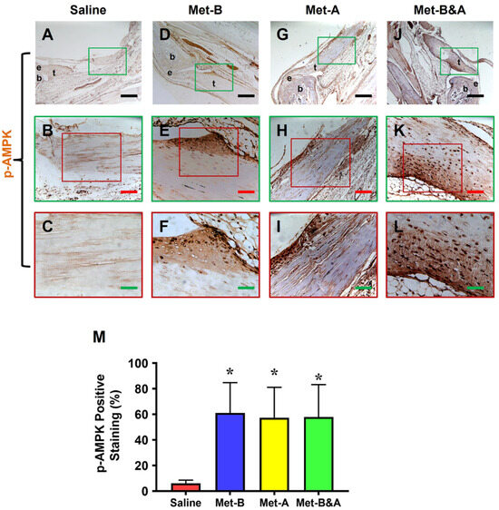 Met injection activates AMPK. IHC staining revealed elevated p-AMPK levels in the wound area of mice injected with Met (indicated by brown areas, (D–L)) in contrast to the minimal p-AMPK staining observed in the saline-injected group (A–C). Semi-quantification results indicated that over 57% of tendon cells in mice treated with Met injection exhibited positive p-AMPK staining. Conversely, less than 6.2% of tendon cells in mice receiving saline injection showed positive p-AMPK staining (M). * p < 0.01 compared to saline. Each of the small boxes, presented in green (A,D,G,J) is correspondingly enlarged in larger boxes (B,E,H,K). Each of the small boxes, presented in red (B,E,H,K) is correspondingly enlarged in larger boxes (C,F,I,L). Black bars: 500 µm; red bars: 200 µm; green bars: 50 µm. Met-B: Met-Before; Met-A: Met-After; Met-B&A: Met-Before-and-After; t: tendon; b: bone; e: enthesis.