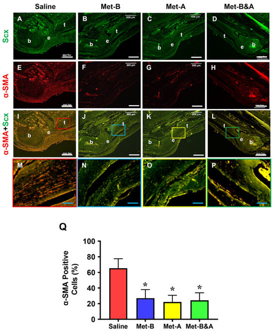 The tissue sections from the wounded Achilles tendons of the mice exhibited numerous α-SMA+ cells (red in Figure 5E,I,M). Met injection inhibited the migration of α-SMA+ cells (red fluorescent cells) in all three treated groups (Figure 5F–P). There was no significant difference in the number of Scx+ cells (green fluorescent cells) in the wound areas across all four groups (Figure 5A–D). The semi-quantitative analysis revealed that 65% of the red fluorescent cells in the tendons of the saline group were located within the tendon tissues. However, 27.1% of the cells in the tendons of the Met-B group, 22.4% in the Met-A group, and 24.3% in the Met-B&A group exhibited red fluorescence (Figure 5Q).