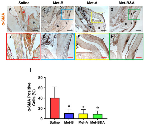 Met injection inhibits α-SMA+ cell migration. The IHC staining shows that α-SMA+ cells (positively stained with brown) were increased in the wound area of saline-injected mice (red arrow, (A,B)). There were few α-SMA+ cells in the Met-B-injected group (C,D), and only minimal α-SMA+ cells were stained in the paratenon of the tendons treated with Met in the other two groups (black arrows; (E–H)). Semi-quantification results indicated that 40.6% of the cells in the saline-treated mice were positively stained with α-SMA. However, 10.9% of the cells in the Met-B group, 10% of the cells in the Met-A group, and 9.4% of the cells in the Met-B&A group were positively stained with α-SMA (I). * p < 0.01 compared to saline. Each of the small boxes, presented in four different colors (A,C,E,G) is correspondingly enlarged in the larger boxes (B,D,F,H). Black bars: 500 µm; red bars: 200 µm. Met-B: Met-Before; Met-A: Met-After; Met-B&A: Met-Before-and-After; t: tendon; b: bone; e: enthesis.