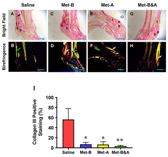 The results also revealed that the healed tendon in the saline group was predominantly formed by collagen III (arrow indicates yellow in Figure 9A; arrow indicates green in Figure 9B). In contrast, the healed tendon tissues in the Met injection groups were mainly composed of collagen I (arrows point to red in Figure 9C,E,G, and yellow in Figure 9D,F,H). Semi-quantification showed more than 56% of the cells in the saline-treated tendons were positively stained with collagen III (Figure 9I). However, about 7% of the cells in the tendon tissues of the mice in Met-B were positively stained with collagen III, about 6.6% of the cells in the tendons in Met-A were positively stained with collagen III, and about 3.5% of the cells in the tendons of the mice in Met-B&A were positively stained with collagen III (Figure 9I).
