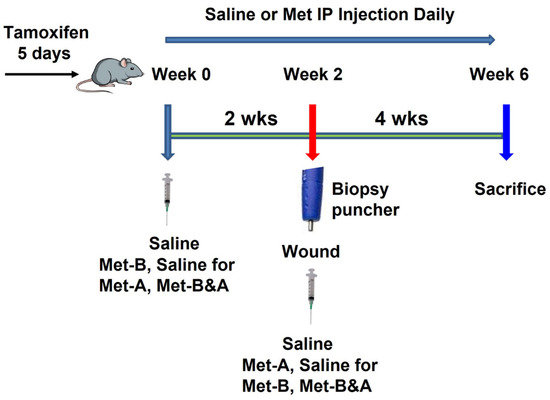 The tamoxifen-inducible α-SMA-CreERT2 mice were crossed with Scx-GFP mice, and then crossed with Ai9 Cre reporter mice to generate triple transgenic α-SMA-Ai9-Scx-GFP mice according to the published protocol, with some modifications [56]. Five consecutive daily IP injections of tamoxifen (100 mg/kg) were administered to the α-SMA-Ai9-Scx-GFP female mice, aged 10 weeks, prior to any intervention. Animals were divided into 4 groups with 6 mice in each group and administered with saline or Met (160 mg/kg) via IP injection daily for 2 weeks. Following this, a window defect was created in the Achilles tendon of all animals using a biopsy punch with a diameter of 0.5 mm. All animals were further injected with saline or Met for the next 4 weeks (Figure 11).