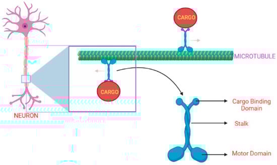 The KIF1A protein’s typical shape and movement along the MT surface in a healthy neuronal cell [15]. (Created with Biorender.com).